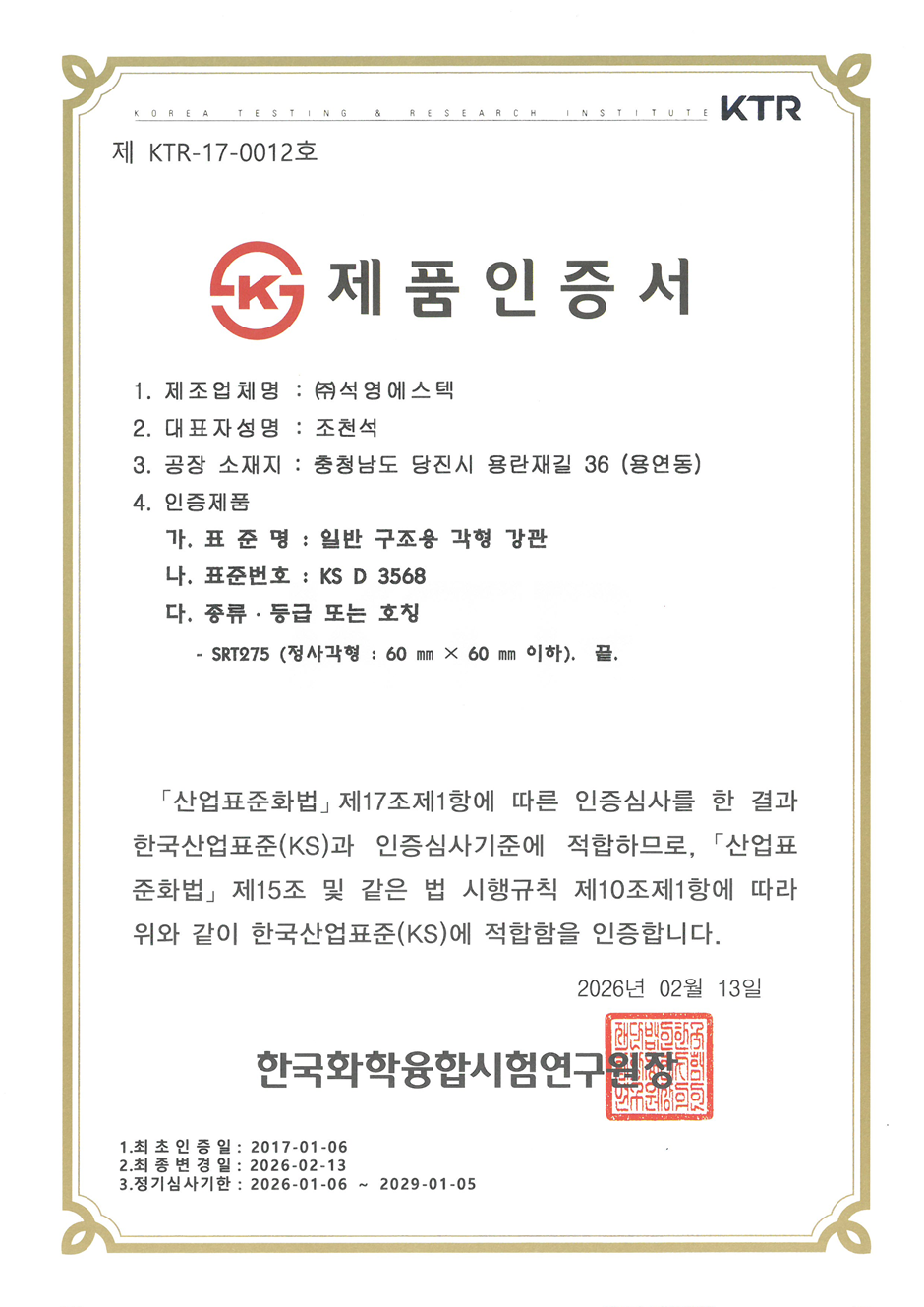 제품인증서 KS D 3760